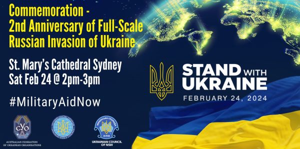 The Ukrainian Council of NSW calls upon all Ukrainians and supporters of Ukraine to join this global series of rallies to commemorate this horrific event at St Mary’s Cathedral forecourt at 2pm on Saturday 24th February.
